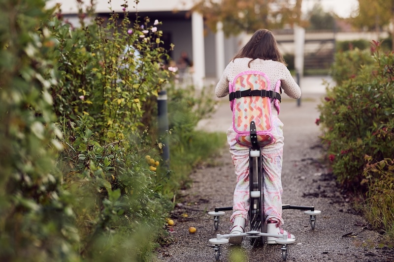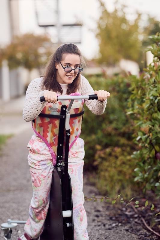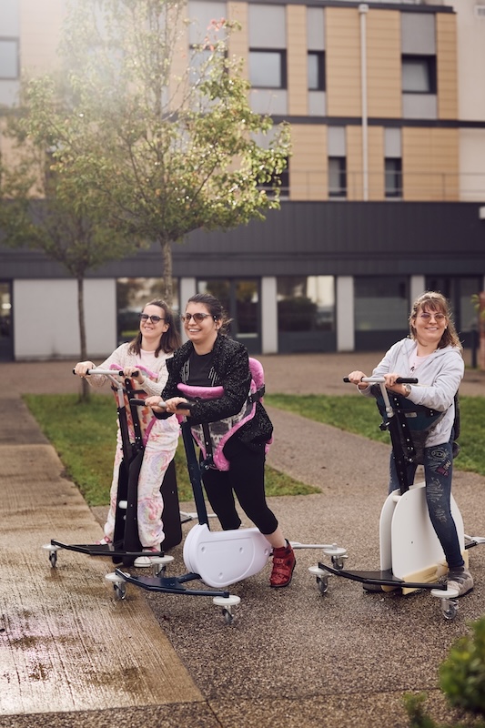 - Favoriser la mobilité autonome : installée sur un support roulant pivotant, la selle permet au patient de réaliser des déplacements autonomes et ludiques, en particulier pour les enfants ou adultes disposant de réflexes de marche mais dépourvus d’autonomie complète.
