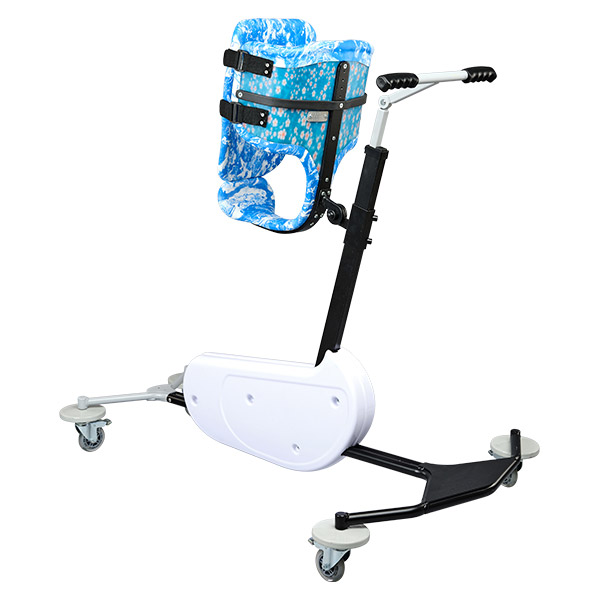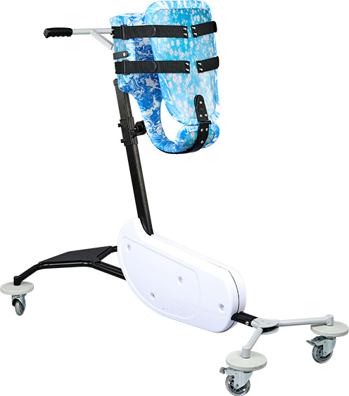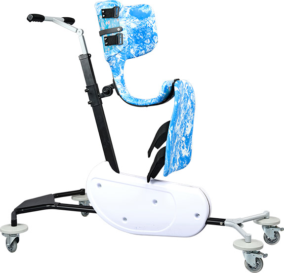 Elle est réalisée en polyéthylène capitonné moulé, montée sur un support fixe ou roulant, permettant au patient de redresser le tronc tout en prenant appui au sol. Ce dispositif favorise également la déambulation lorsque cela est possible.