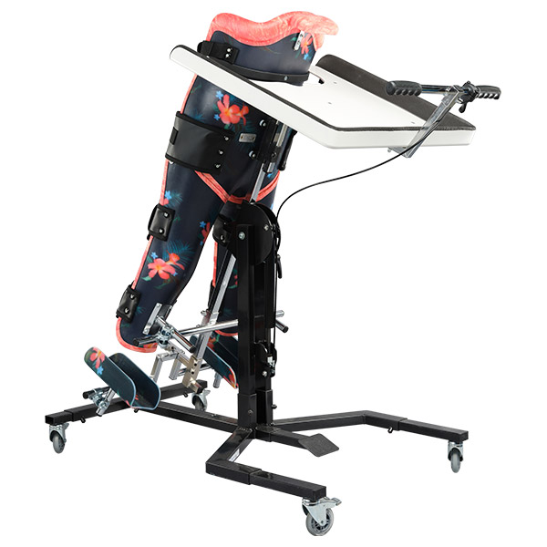 Le châssis de verticalisation a été imaginé par la société Albatros France pour recevoir une coque réalisée sur moulage. La progressivité est assurée par un vérin, permettant ainsi une verticalisation de 0° à 90° en toute sécurité. Le support est évolutif et permet de nombreux réglages pour suivre la croissance et l’évolution de la pathologie.
